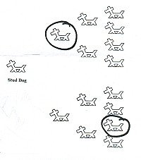 The formula Brackett preferred concentrated genes in a pedigree. He did this by placing emphasis on the sire of the sire. In Figure 1, notice that the same dog appears on the sire and the dam's side of the pedigree. Brackett liked to use one important dog and have it appear twice in a three-generation pedigree. The basic formula he preferred can be stated as follows, "Let the sire of the sire become the grand sire on the dam's side". Said another way, let the father's father become the mothers grandfather.
