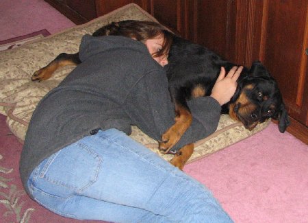 THESE TWO PICTURES ARE OF ME AND GOLDI. GOLDI IS HERE BECAUSE SHE IS GOING TO BE BRED TO YNGO. JEEZ CAN YOU IMAGINE HOW WILD THOSE PUPPIES ARE GOING TO BE!!! GOLDI AND I ARE DEMONSTRATING OUR SHARING OF COMFORT!! ME ON HER THEN HER ON ME!