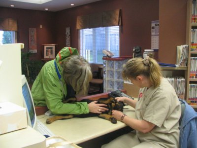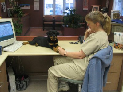 socializing at the vet clinic. She's shown above with Mary, who