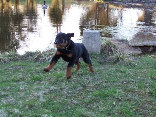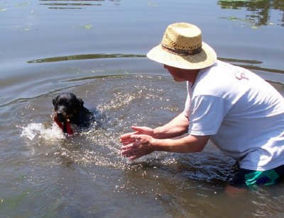 6.05.2005 Hi Everybody!! I went swimming today! Daddy went in with me and I decided I could be brave too! Mom says I come from swimmers so I should have no problem. dad had my favorite tuggie too. I retrieved it a lot. Here is a picture of me swimming back to shore with my tuggie! Dad threw it out too far and it sank. Mom wasn't too happy with Dad cause now she's got to order a new one online! There were nasty geese who thought the whole pond was theirs-Mom ran interference for me-they don't mess with her! Well- I gotta go take a nap-I'm tired from all that swimming! Jerome |