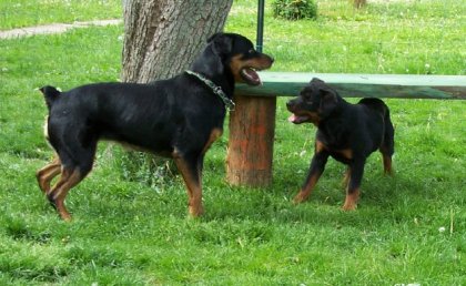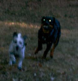 07.21.06 Ok-it's finally cool enough to sit in Mom's office and type. Don't get me wrong it's still hot but bearable-for the moment!! I thought I might give you my thoughts on this new little sister of mine! (NO ONE asked me if this whole deal was ok-by the way-let me make that perfectly clear). As the Prince of this household I do expect to have a say in these big decisions!! Takoda- as they call her does have her benefits- First and foremost- Roury plays with her a lot-this means I don't deal a lot with puppy teeth!(of course they could be forming some kind of alliance to over throw me-I'd better watch that I get extra food- whatever my little sis doesn't finish-I get- after Mom's okay of course. Since I work so hard Mom says it won't hurt. I also get extra cuddles in the morning. I creep up in Mom and Dad's bed in the morning and get cuddle time with Mom(shhhhh-I'm suppossed to be tough so don't tell anyone). I try to play with Takoda. I do extra speedy play bows and extra loud barks to play but she just freezes in place!! Then she tries to steal my toys!!! I try to play tug too but I end up ripping the toy away before she can even get a grip! I do worry about her getting into trouble so I follow her around. I want to tattle on her!! We do hang out in our yard together. Mom and Dad keep a watchful eye on us but we graze togther. We try to get Miss T to chase us around the bushes but she's a bit too little yet-Mom says she'll be big soon enough-don't ruin it!! We LOVE going up to the pond- I swim but lil sis is still too chicken!! I help dad remove the pond weeds from the pond. he breaks them loose and I carry them to shore. Overall,I think she's ok but Mom makes a fuss over me every chance she gets and takes me on my own walks and classes. I like to run along side the bike but we haven't been able to do that since it's been so hot. I think I can but mom says no! Well- that's it for now!!! Gotta go to bed! We get up early for our walks before Mom goes to work!! Jerome!! |