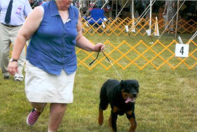 8.7.2005 Hi Everyone!! It's been a while since I posted a report. It's been real hot and Mom's office isn't air conditioned so I prefer to stay downstairs where it's cooler. Today we went to another one of those conformation show things. I saw lots of neat looking dogs(at least I think some of them were dogs-though I can't be 100% sure). It was a cloudy day with a breeze so we sat ringside on the cool grass. It was nice out for me. I met lots of nice people and they all told me how handsome I was. I went into the ring and tried VERY hard to be good and stand still. It's kinda boring but mom tries to keep me entertained and with those shoes she wears it's hard not to chuckle at her. I let the judge look at my teeth and check me out like a good boy. I trotted around the ring with my mom on a loose leash(we practice that a lot). Then I went back in with 2 other big boys. I did my best to be good again. Mom gives me lots of cookies when I am good!! YUM!! We didn't get another ribbon but you would of thought I won cause all the people who came up to see me and pet me after we got back to our stuff. Everyone told me I shoulda got another ribbon cause I did so well. Mom says my time will come and we're just goin for fun. Then we went to the pet store booth and Eddie-the owner- gave me even more cookies!! We came home and I played with my sister for a while. She's feeling much better after having her tooth pulled. Then I took a nap and Mom and Dad went to something called a fair. They came back a little bit ago and fed us dinner. I'm gonna go and hang out downstairs after I'm done with this report. Mom says to tell everyone congratulations to everyone who did so well this weekend. She says a lot of the Esmond family did really well at a lot of things. I attached a picture of me trotting around the ring. Mom said not to cause the leash isn't correct but i think I look good and that's what matters so that's that. Well gotta go-it's getting too hot for me up here!!