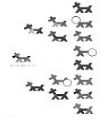 Brackett knew that Mendel was able to consistently predict the traits in his offspring especially when he knew what characteristics were carried in the pedigrees of the parents. They both knew that when two individuals with known ancestry are bred there is more certainty about what they are likely to produce then when there is missing information about them. Mendel demonstrated these principles in the 1860's. Brackett used these ideas because he knew that the unexpected is more likely to occur when there are gaps in information about the ancestors and their littermates. While heredity has the tendency to produce resemblance's, the science of genetics teaches us to search beneath the superficial resemblances of the phenotypes for the important clues in the genotypes. Thus, when an individual is said to be dominant for a trait, it should be taken to mean that a large percentage of their offspring were observed to have a certain trait. It does not mean that all of their offspring will have that trait. Figure 2 illustrates how Brackett would approach breeding a hypotical bitch called "A". The Stick Dog Color Chart pedigree described in Battaglia's book, Breeding Better Dogs is used to illustrate Brackett's approach. The stick dog pedigree illustrates how the strengths, weaknesses and trends in a pedigree can be recorded and then easily coded. Notice that each stick figure is drawn with seven structural parts. Using the breed standard each of the seven structural parts are color coded to show there quality or lack thereof. The color-codes for quality: