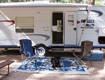 9.28.2005 Ok- now that I'm a bit rested (Mom has me under house arrest since I jammed my toe playing with my new sister-an NO I didn't jam it on her since she's so short-I'm much better now) I will write my official vacation memoirs!! Day 1 stunk as you all know. Things much improved on day 4 when we got our new house on wheels. I got to take lots of walks and saw Mule Deer, Buffalo and Wild Turkeys. Mom and Dad saw lots of other wildlife but not with me cause I'm big and scary. I got to meet a miniature dachshund named Jackson Rider who I thought was just wonderful. We played a lot. I would lay down to get on his level and roll on my back while he ran all over me. At night we had campfires and I got lots of roasted marshmallows! I LOVE those things. I wish Mom would use them as bait in the ring. She says that would be hard to do. I was a good camper and minded my manners though sometimes it was hard, especially in the tent cause you could hear everything and I had to protect my Mom and Dad. The weather was beautiful- except for Minnesota- both going out and coming back the weather there was bad. I feel sorry for anyone that lives there!! Of course I got my new sister! We're still having a ball... I have to rate the trip a success, though I am glad to be home. I really missed my classes and was a bit boisterous and eager to work when I got to them!! Mom had to make me sit and stay to get my attention cause I just wanted to Go Go Go.