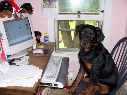 07.21.06 Ok-it's finally cool enough to sit in Mom's office and type. Don't get me wrong it's still hot but bearable-for the moment!! I thought I might give you my thoughts on this new little sister of mine! (NO ONE asked me if this whole deal was ok-by the way-let me make that perfectly clear). As the Prince of this household I do expect to have a say in these big decisions!! Takoda- as they call her does have her benefits- First and foremost- Roury plays with her a lot-this means I don't deal a lot with puppy teeth!(of course they could be forming some kind of alliance to over throw me-I'd better watch that I get extra food- whatever my little sis doesn't finish-I get- after Mom's okay of course. Since I work so hard Mom says it won't hurt. I also get extra cuddles in the morning. I creep up in Mom and Dad's bed in the morning and get cuddle time with Mom(shhhhh-I'm suppossed to be tough so don't tell anyone). I try to play with Takoda. I do extra speedy play bows and extra loud barks to play but she just freezes in place!! Then she tries to steal my toys!!! I try to play tug too but I end up ripping the toy away before she can even get a grip! I do worry about her getting into trouble so I follow her around. I want to tattle on her!! We do hang out in our yard together. Mom and Dad keep a watchful eye on us but we graze togther. We try to get Miss T to chase us around the bushes but she's a bit too little yet-Mom says she'll be big soon enough-don't ruin it!! We LOVE going up to the pond- I swim but lil sis is still too chicken!! I help dad remove the pond weeds from the pond. he breaks them loose and I carry them to shore. Overall,I think she's ok but Mom makes a fuss over me every chance she gets and takes me on my own walks and classes. I like to run along side the bike but we haven't been able to do that since it's been so hot. I think I can but mom says no! Well- that's it for now!!! Gotta go to bed! We get up early for our walks before Mom goes to work!! Jerome!! |