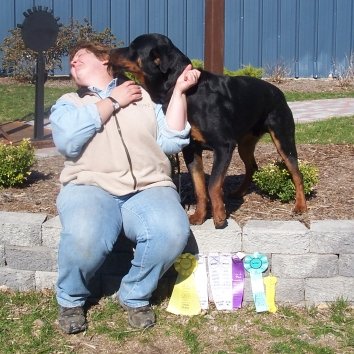 11.25.05 Miss Ann asked a while ago for an update to my blog(she already updated my page). I am SO tired but Mom says I should get on the stick!! Last weekend I did something called sheep herding. Those wooly things were a bit funny looking and I wanted to get a closer look. The lady in charge really seemed to like me. I was the only Rottie there-the rest were little dogs. I tried digging under and them thought about jumping over but my test jump showed the fence a bit too high. :( I listened to my Mom real good and she seems really happy with my work but metioned something about going into debt with the "boy's" new hobby. I'm guessin she's talkin about me. What are kids for?? Then yesterday Mom left me and my sister home with Uncle Oscar- we like him a lot. We rested while Mom and Dad went to Grandma and Grandpas house. They got home kinda late but bought us home leftovers so we didn't complain dinner was late! YUM!!! Today Mom took me and Aunt Lisa to a Laura Derret agility Fundementals seminar. It was fun! Mom says I did real good and it was a long day. It was from 9-4 and was a little over an hour away. The building was VERY cold but mom bought my crate in and put my thick bed in and covered it-I was nice and toasty. Mom wasn't though-they didn't tell her the building wasn't heated and it was 29 degrees today. I did everything Laura asked me to and I could tell she liked me!! We even stayed afterwards to get filmed for their new video on how to play with your dog. Some people don't appparently. I got filmed tugging with Mom. They wanted to show different breeds playing not Border Collies and Goldens and stuff. I was the only Rottie there and I was good most of the time. The woman lying on the floor(Mom doesn't know why -kinda freaked me out) She blended in with the floor mats and she moved real quick and scared me cause I didn't see her right away. I barked at her and Mom got my attention and got me working again. I was tired by that time but I tried to be good (and was) the rest of the day. Mom says anyone interested should go to this seminar cause it was a good learning experience. Sunday I have class in the park- Mom hopes it's warmer-WIMP!! Then Monday I have agility and Wednesday I have obedience. Ther are some agility matches and another workshop coming up. YAWN- Well I gotta to go to sleep-I'm REALLY tired from today!! Hope Miss Ann is okay with this edition of my blog. My mind is kinda fuzzy but I think I remembered everything!